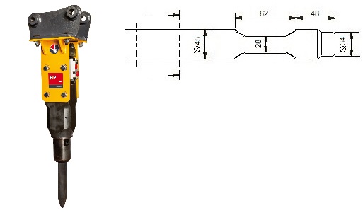 Compatible with Indeco models HP 150 / MES 121/150. The cutting edge of the chisel is cross to driving direction of the excavator, with the exception of the Asphalt cutter, this one stands parallel to driving direction of the excavator.